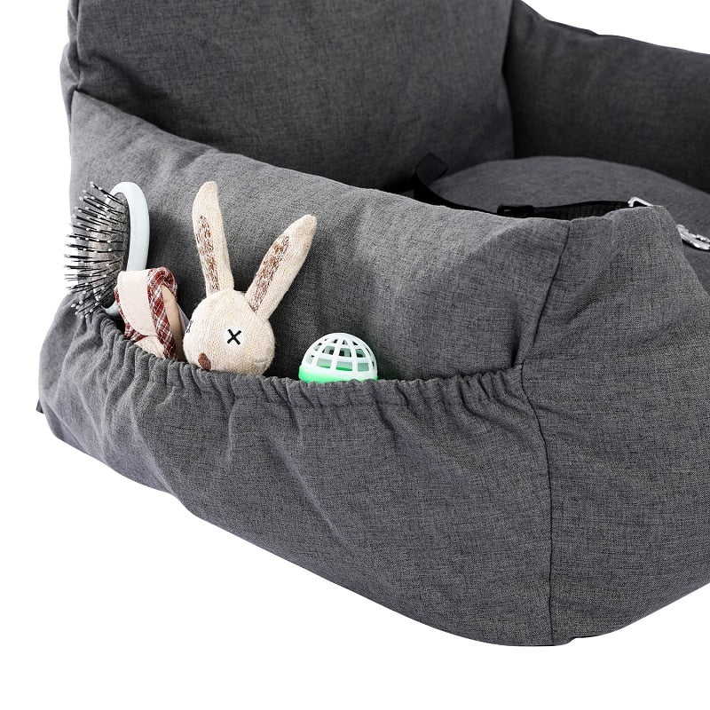 It can be installed in the car's front seat or rear seat based on your like; There are storage bags on both sides, can hold pet daily necessities.